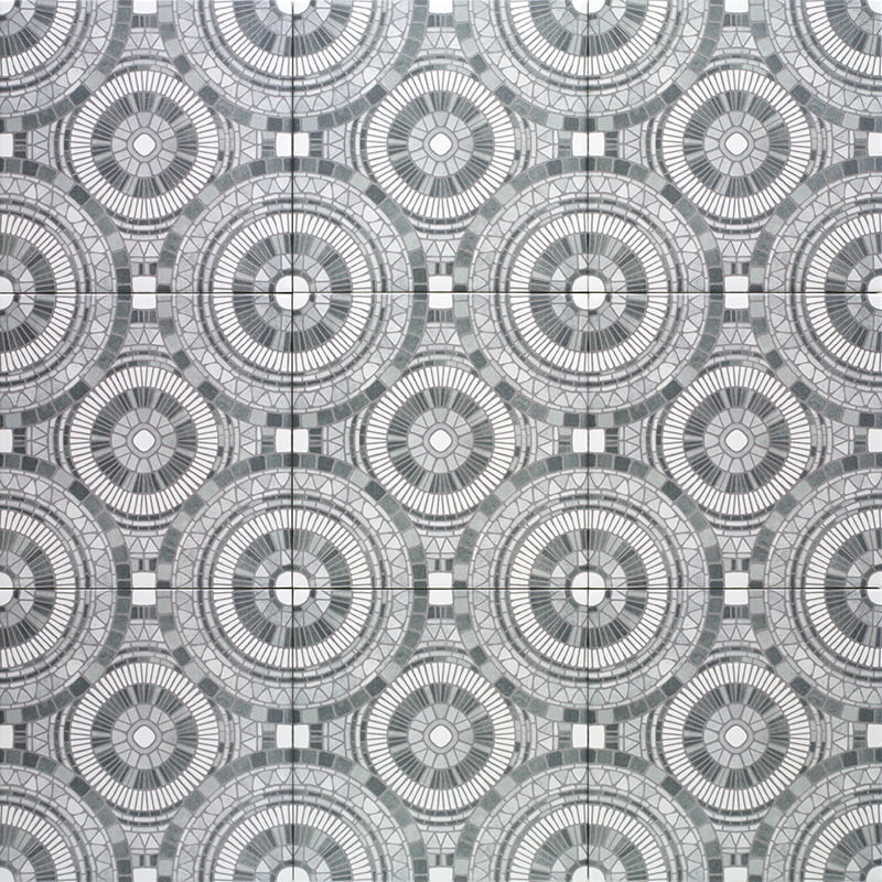 El azulejo Decor Halo 20×20 de Mainzu destaca por su diseño geométrico circular de gran impacto visual, inspirado en patrones radiales que aportan dinamismo y sofisticación a cualquier espacio.