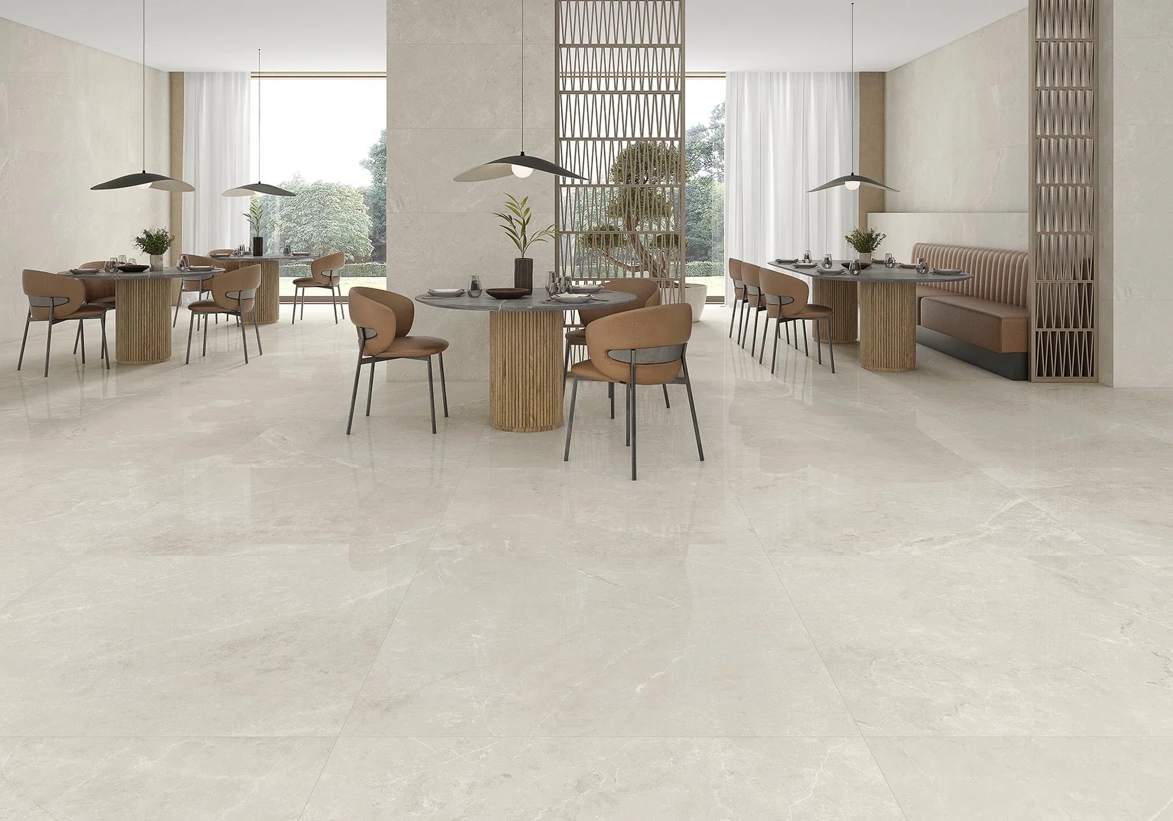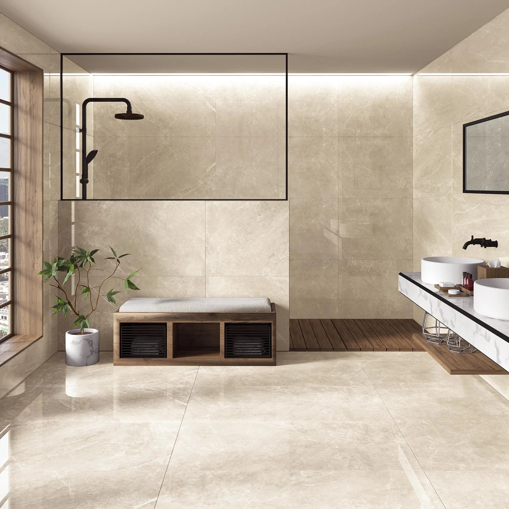 • 120×120 cm: El formato de gran tamaño con 10,5 mm de espesor y 14 caras, que minimiza el número de juntas y amplía visualmente el espacio.