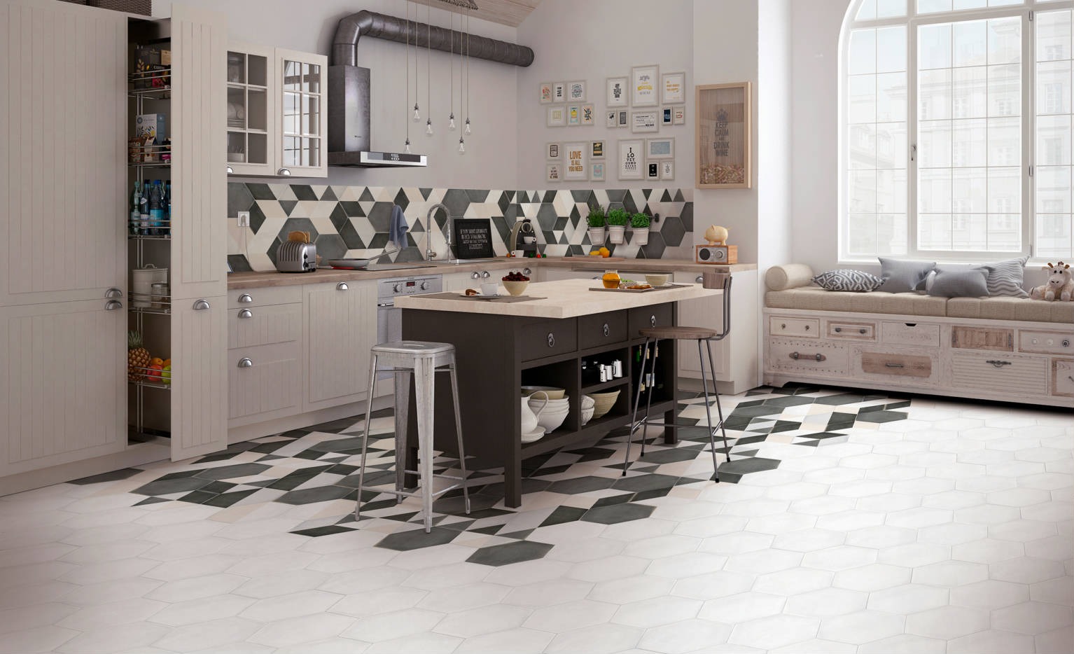 Este modelo puede instalarse tanto en paredes como en suelos, ya sea de forma individual para un efecto monocromático limpio, o combinándolo con otros colores lisos o decorativos de la misma serie para lograr composiciones personalizadas. Su forma hexagonal permite jugar con la orientación, los contrastes y los ritmos visuales, ofreciendo una estética creativa y versátil.