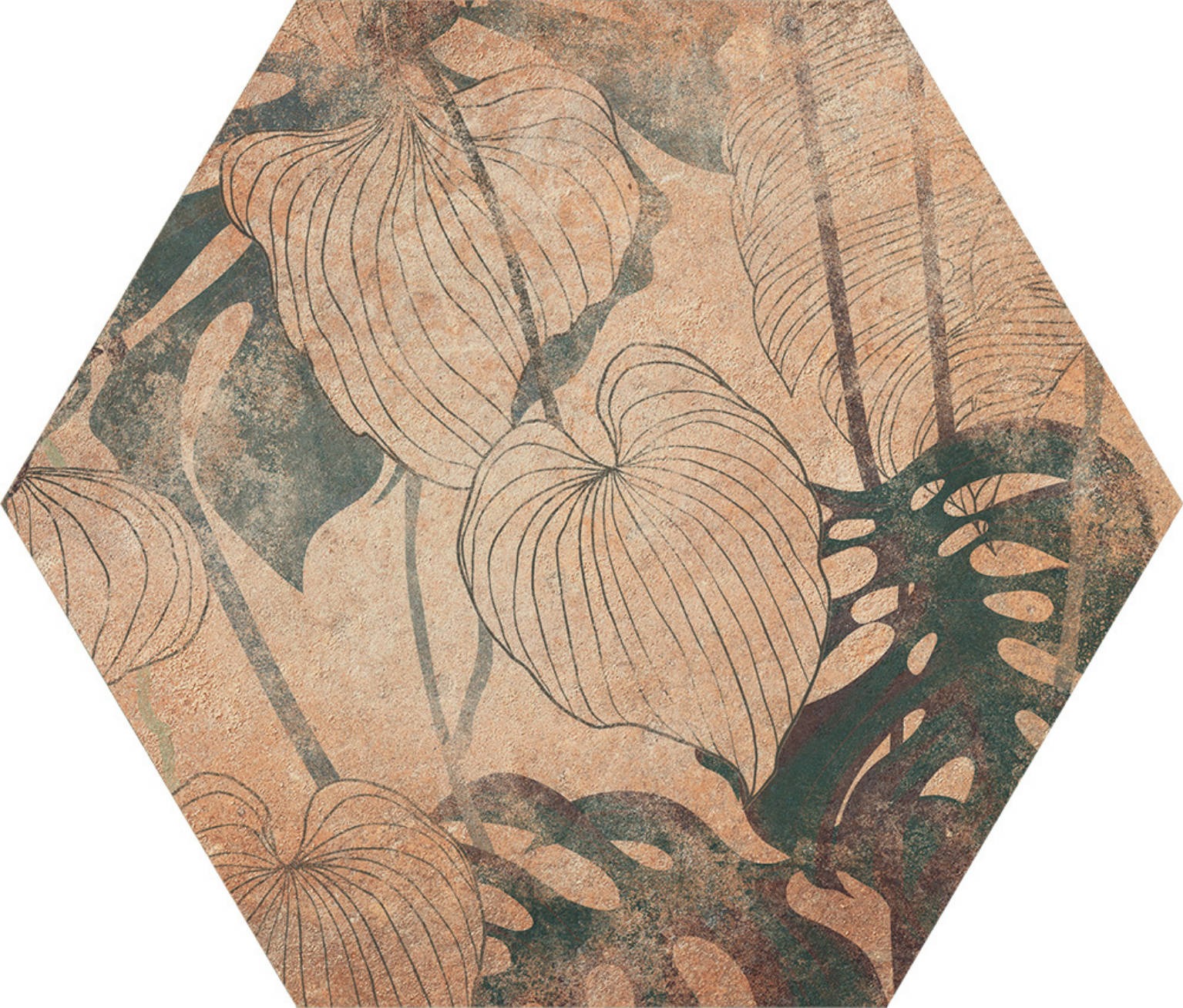 Hexa Maison Flora de Keros es un revestimiento porcelánico en formato hexagonal de 23×27 cm que combina el encanto del diseño floral con la calidez del tono terracota. Su patrón, decorado con motivos vegetales en verdes suaves y beige, evoca un estilo romántico y natural que transforma cualquier espacio en un ambiente acogedor y lleno de personalidad. El acabado mate potencia su apariencia artesanal, suavizando la superficie y eliminando reflejos, lo que permite que los colores destaquen con elegancia.