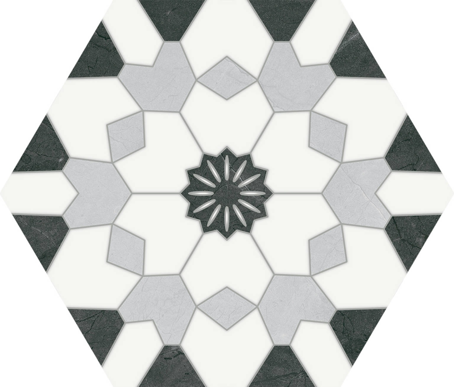 Hexa Venezia Nero es un azulejo cerámico hexagonal de 23×27 cm que destaca por su diseño audaz, elegante y moderno. Su base en color negro profundo, combinada con patrones geométricos en blanco y gris, lo convierte en una opción visualmente impactante, ideal para quienes desean crear espacios llenos de personalidad. Es apto tanto para suelos como paredes, lo que permite una total libertad creativa a la hora de diseñar interiores residenciales o comerciales.