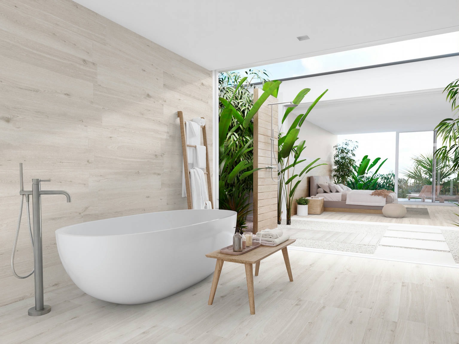 Disponible en un formato alargado de 23×120 cm, el Sia Blanco ofrece una solución estética muy apreciada por arquitectos y diseñadores, ya que permite crear superficies continuas, limpias y visualmente expansivas. Este formato es perfecto para quienes buscan un pavimento o revestimiento que combine la elegancia de las grandes piezas con la naturalidad de un diseño sutil. Al ser alargado, también permite jugar con distintas disposiciones durante la instalación, como la colocación en espiga, alineada o desfasada, lo que añade dinamismo visual sin perder la armonía general del ambiente.