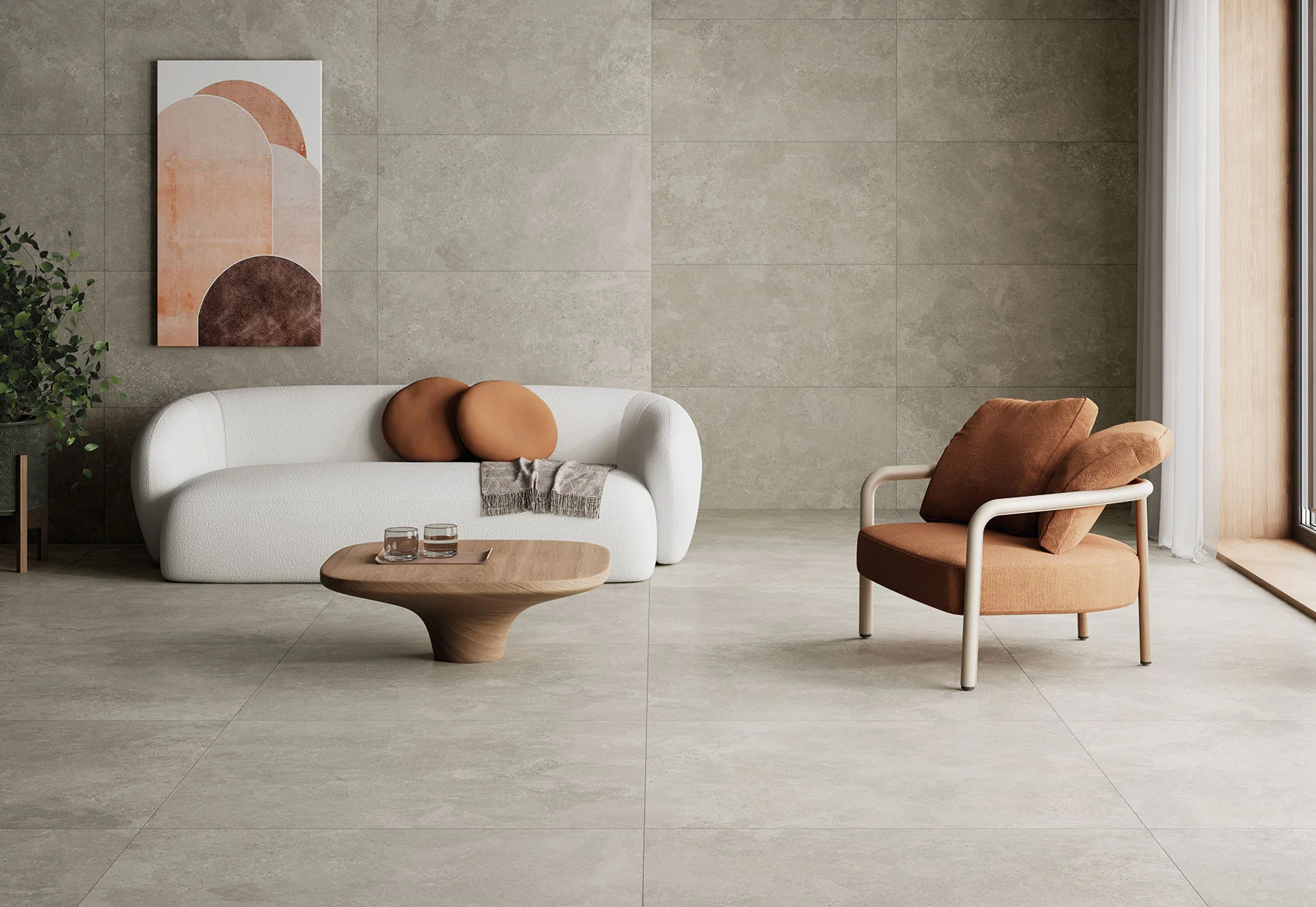 Los formatos de gran tamaño, como 90×90 y 120×120, potencian el efecto de superficie continua y son ideales para salones amplios, cocinas abiertas y espacios comerciales donde se busca una estética limpia y contemporánea.