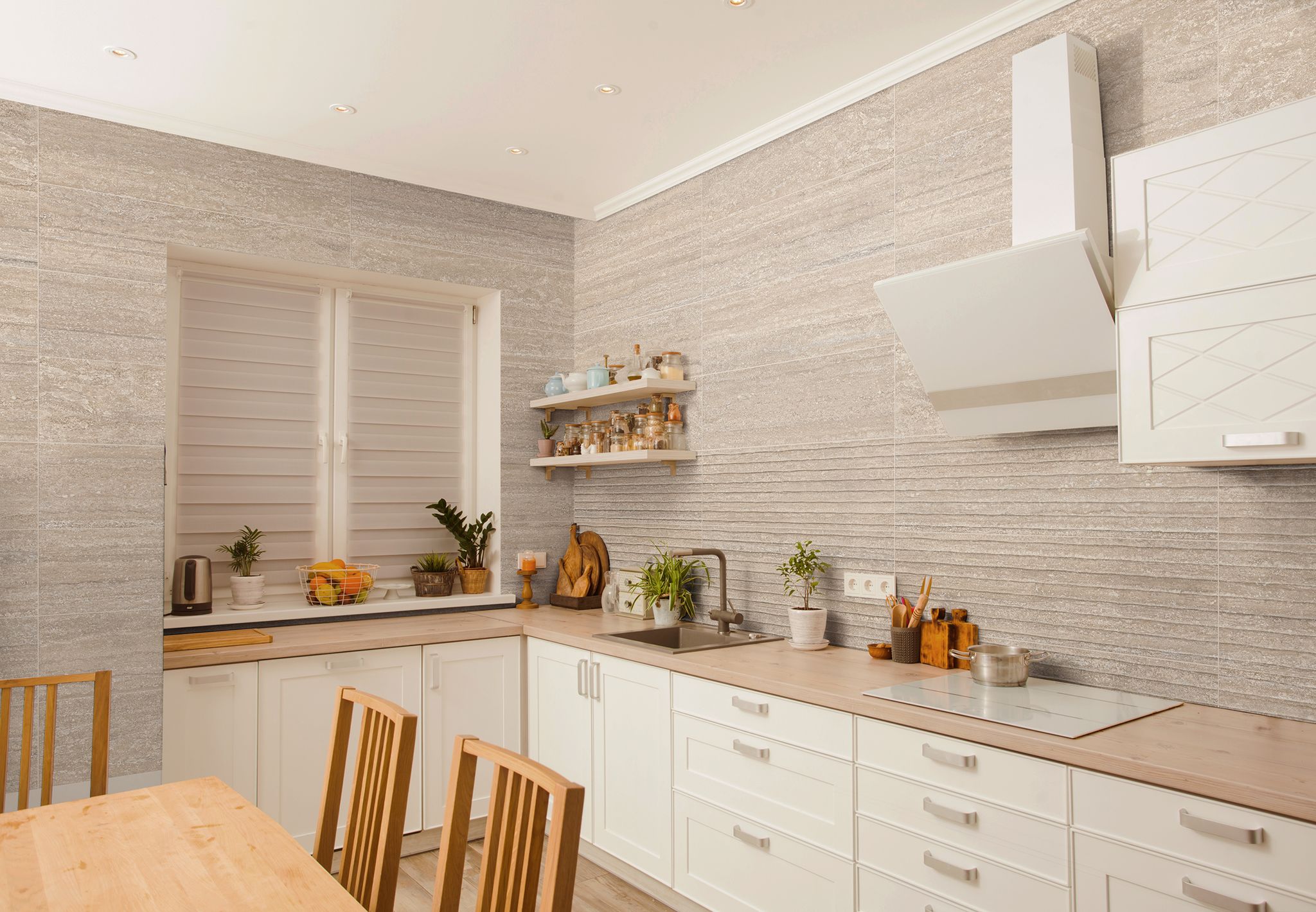 La tonalidad beige cálida del Tivoli Wave Bone es otra de sus grandes virtudes. Este color neutro y luminoso proporciona una sensación de calma y confort, siendo ideal para crear ambientes acogedores y equilibrados. Su versatilidad cromática permite que combine armoniosamente con materiales naturales como la madera, la piedra o incluso elementos metálicos, dando lugar a composiciones que se adaptan tanto a estilos rústicos como a propuestas más modernas o minimalistas.